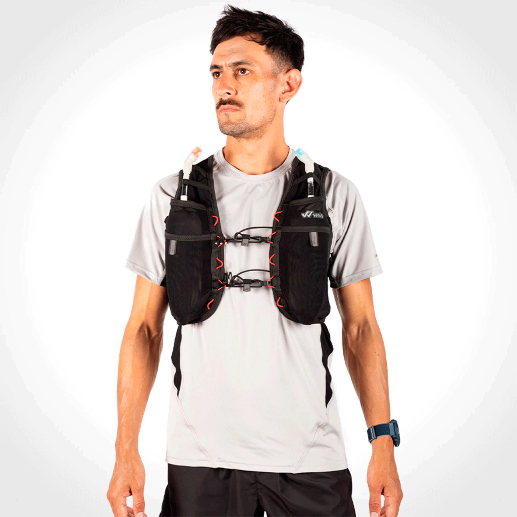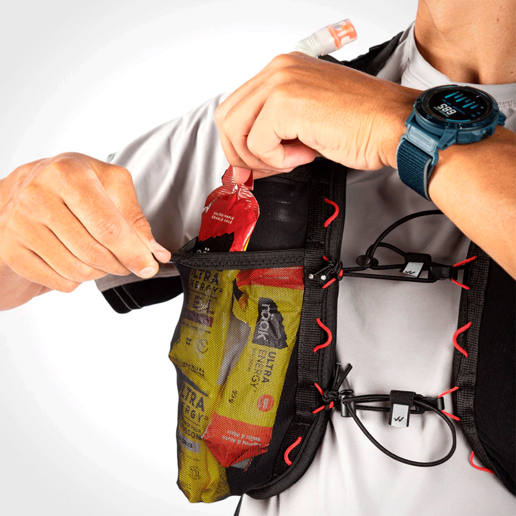 Mantiene la cantidad de bolsillos y compartimentos de su versión anterior, pero ahora ofrece mayor practicidad y accesibilidad al duplicar la capacidad frontal: incorpora dos nuevos bolsillos delanteros diseñados para llevar alimentos, soft flasks adicionales, el celular o cualquier elemento esencial para entrenamientos o competiciones.