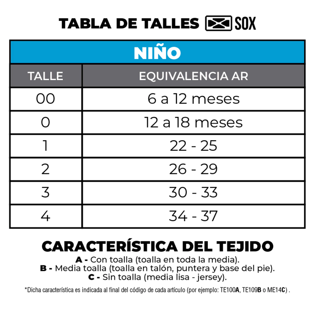 Medias con puño doble elastizado, caña ¾ y toalla en toda la media. Empeine y tobillo elastizados para mayor sujeción, costura de puntera extra plana y refuerzos en talón y puntera. Ajuste y calce perfectos gracias al agregado de spandex.