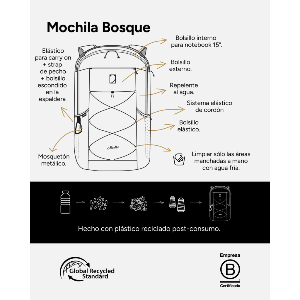 Con su diseño funcional y materiales de alta calidad, la Mochila Bosque I es la compañera ideal para viajes, trabajo o actividades al aire libre.
